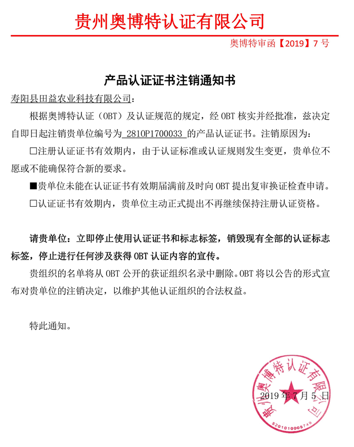 注銷壽陽縣田益農業科技有限公司產品認證證書通知