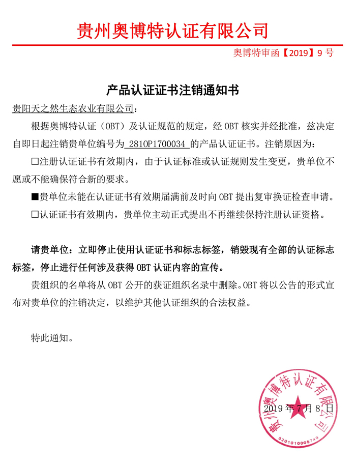 注銷貴陽天之然生態農業有限公司產品認證證書通知