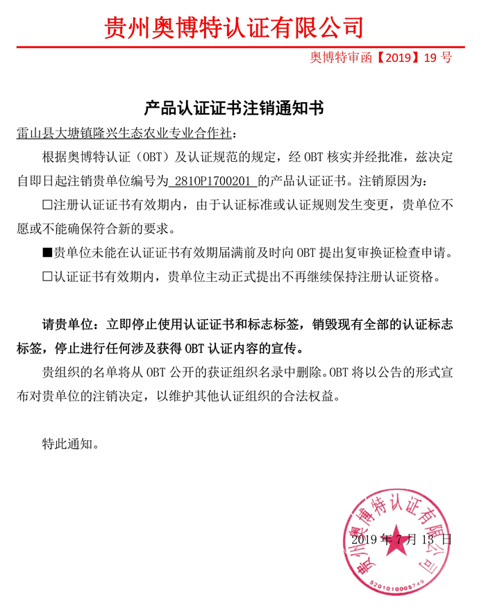 注銷雷山縣大塘鎮隆興生態農業專業合作社產品認證證書通知