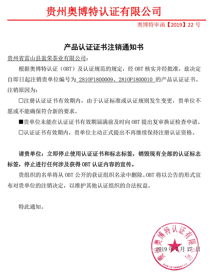 注銷貴州省雷山縣蚩榮茶業(yè)有限公司產(chǎn)品認(rèn)證證書通知
