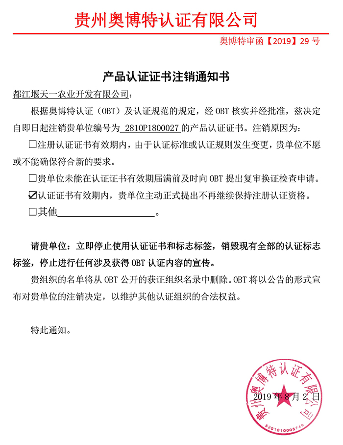 注銷都江堰天一農(nóng)業(yè)開發(fā)有限公司產(chǎn)品認證證書通知