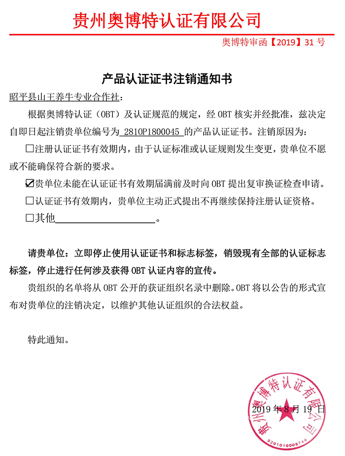 注銷昭平縣山王養牛專業合作社產品認證證書通知
