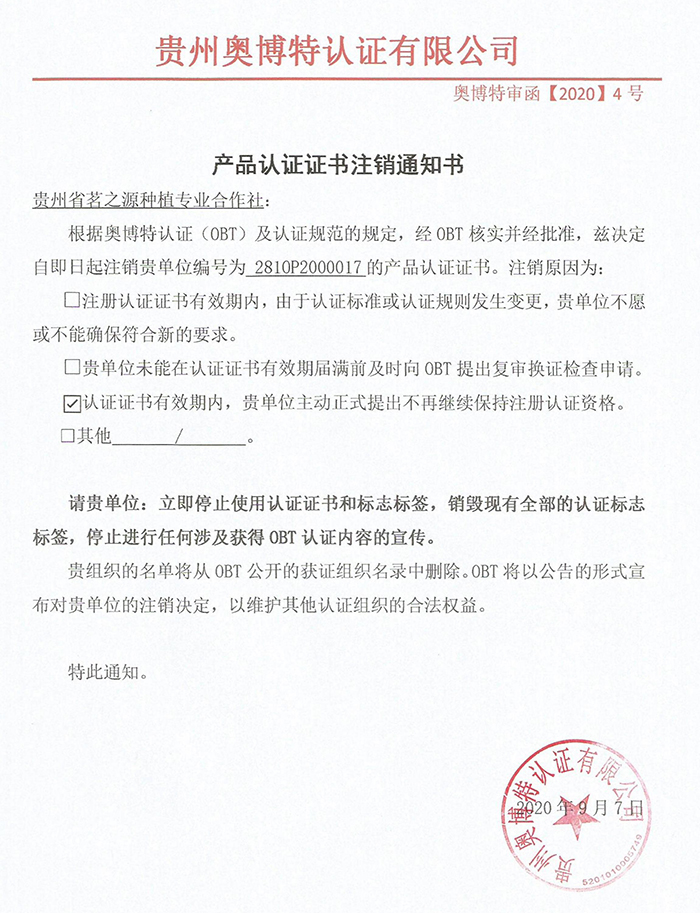 注銷貴州省茗之源種植專業(yè)合作社產品認證證書通知
