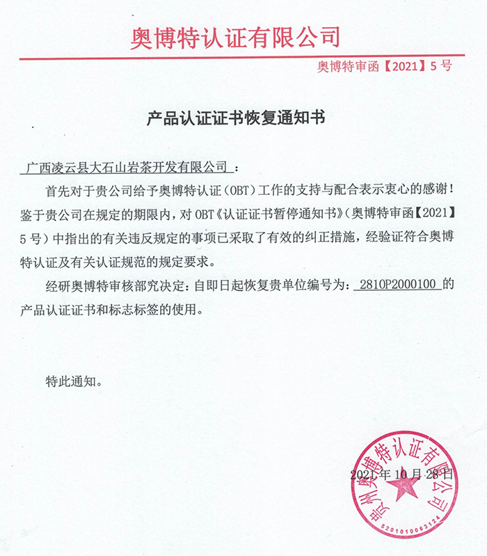 恢復廣西凌云縣大石山巖茶開發有限公司產品認證證書通知