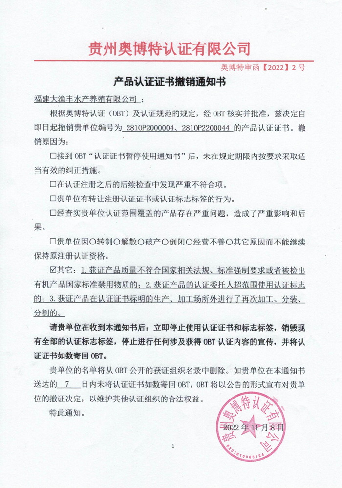 撤銷福建大漁豐水產養殖有限公司產品認證證書通知