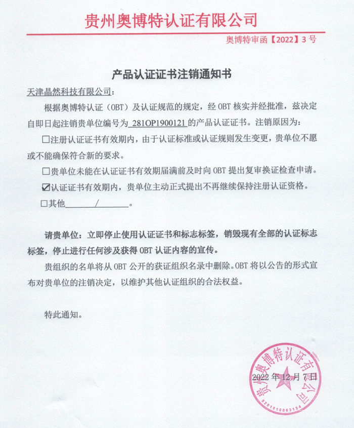 注銷天津晶然科技有限公司產(chǎn)品認(rèn)證證書通知