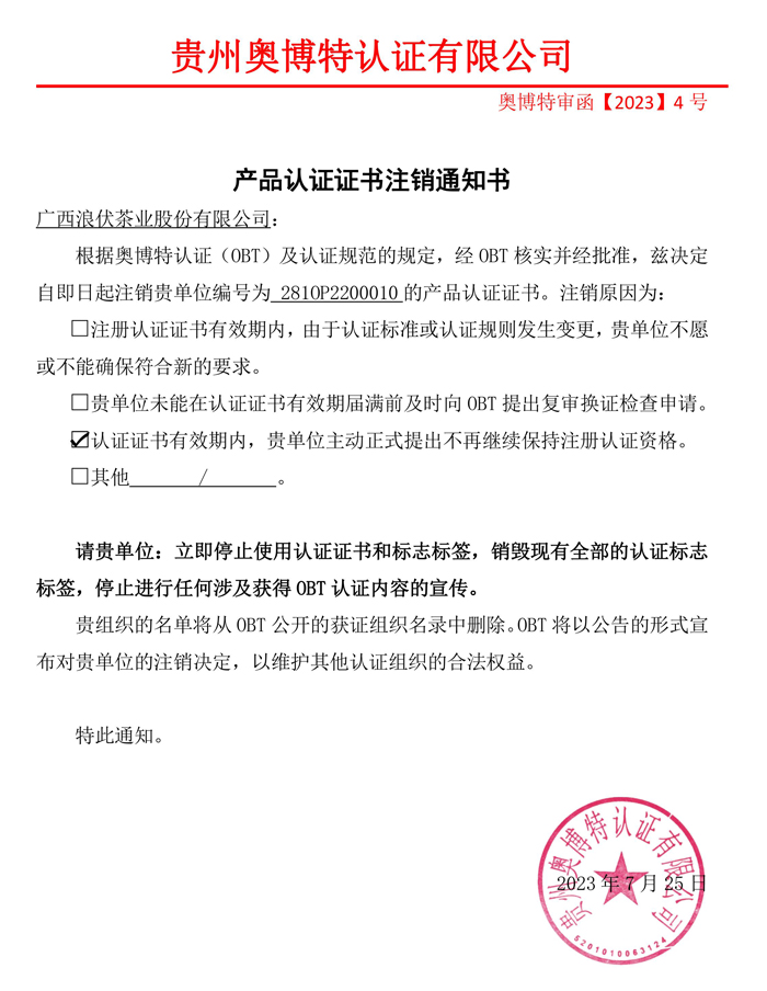注銷廣西浪伏茶業(yè)股份有限公司產(chǎn)品認證證書通知