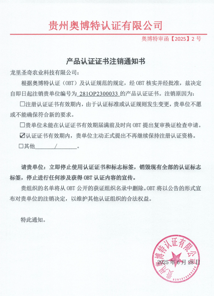 注銷龍里圣奇農業科技有限公司產品認證證書通知