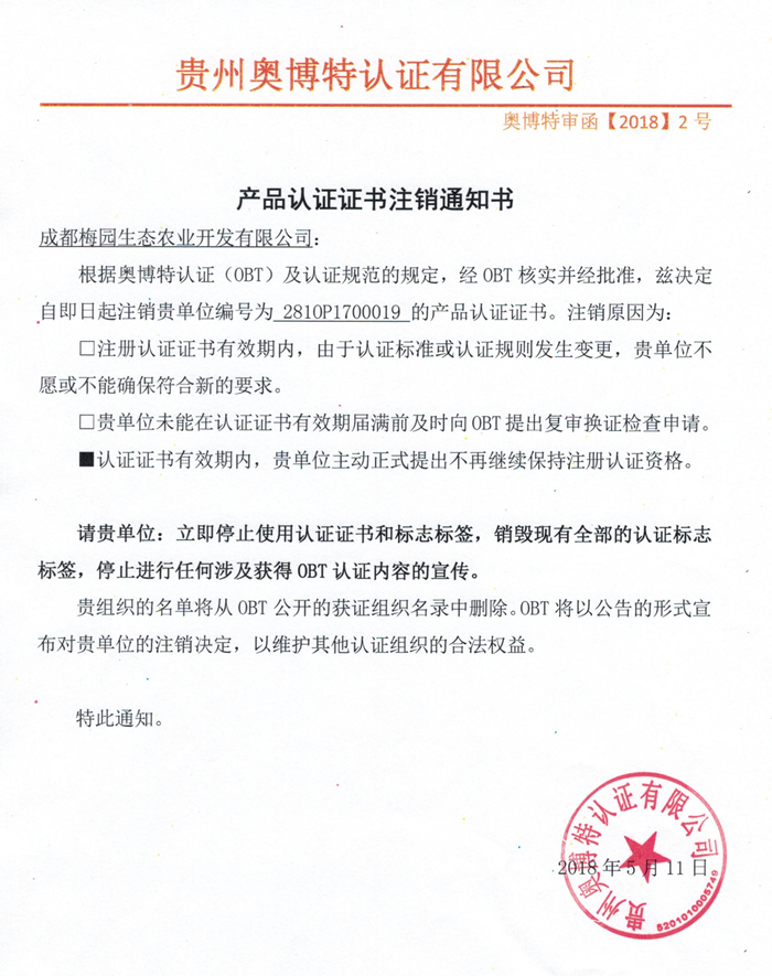 注銷成都梅園生態(tài)農(nóng)業(yè)開發(fā)有限公司產(chǎn)品認(rèn)證證書通知