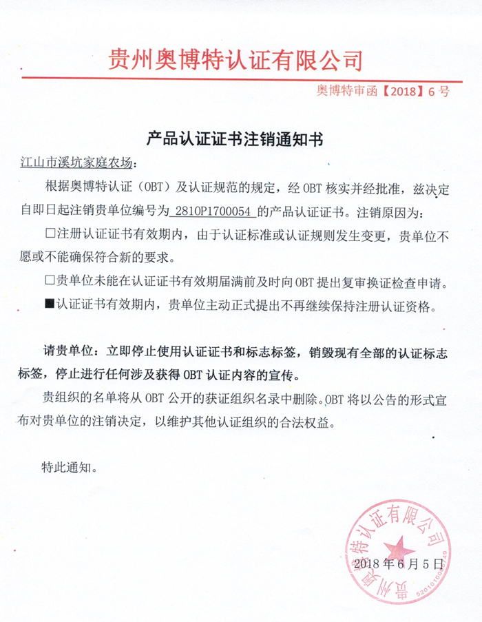 注銷江山市溪坑家庭農場產品認證證書通知
